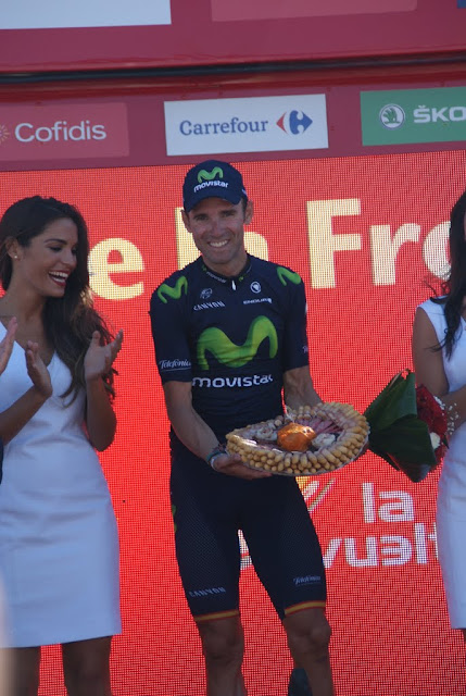 Presenciamos la ceremonia de entrega de premios y los maillot de las distintas clasificaciones de la Vuelta. La nota anecdótica fue la entrega a Valverde de una tarta "iberica" repleta de ricas viandas que si la prueba casi seguro que da positivo.